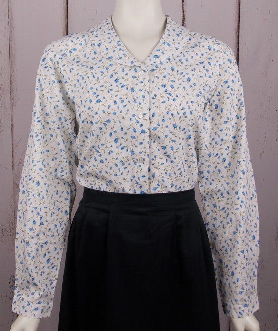 Ladies, you will love this Victorian, Old West floral style ranch blouse. This ranch style blouse has a full button front with a band collar. The blouse features three pleated panels on each shoulder with gathered sleeves and three button cuffs . This blouse is a heavier fabric and provides a very authentic look and fee. This vintage style blous...